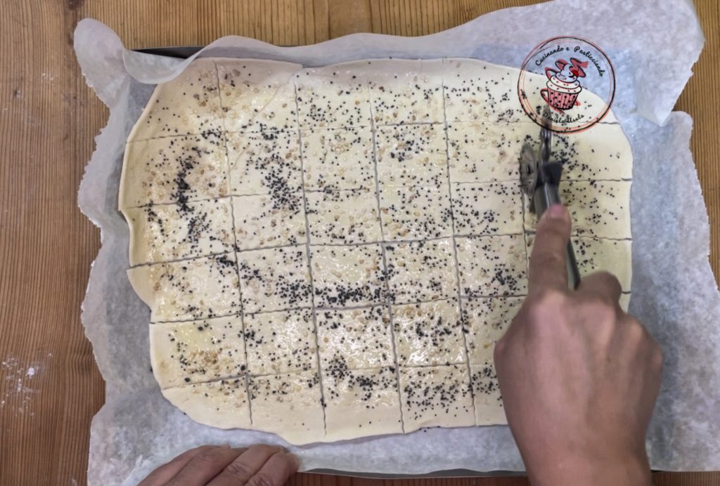 Con la ayuda de un cortador de pasta, formar muchos cuadraditos y hornear a 200°C durante unos 15 minutos.