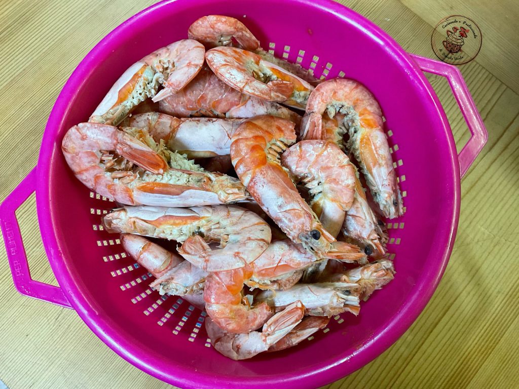 Limpiar las gambas del intestino y eliminar las patas. Hervir en agua caliente durante unos 15 minutos.