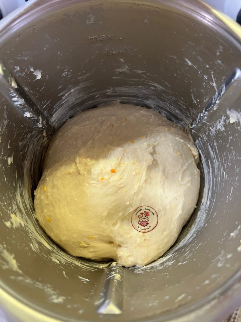 Añade luego la cáscara del limón, el licor y la sal y continúa amasando a velocidad media durante unos 10 minutos.