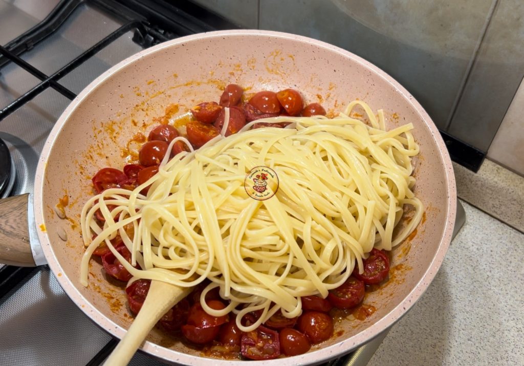 Verter las linguine al dente sobre los tomates, mezclar y servir.