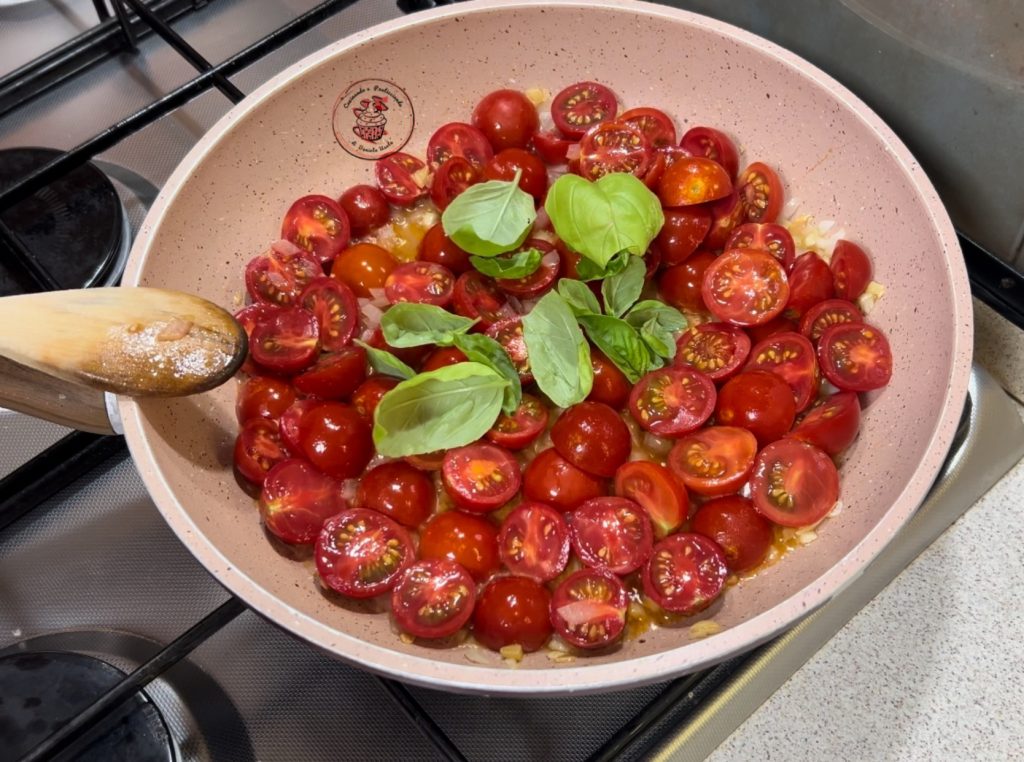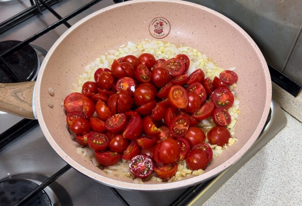 Añadir los tomates cherry lavados y cortados por la mitad y continuar la cocción durante unos 10 minutos.