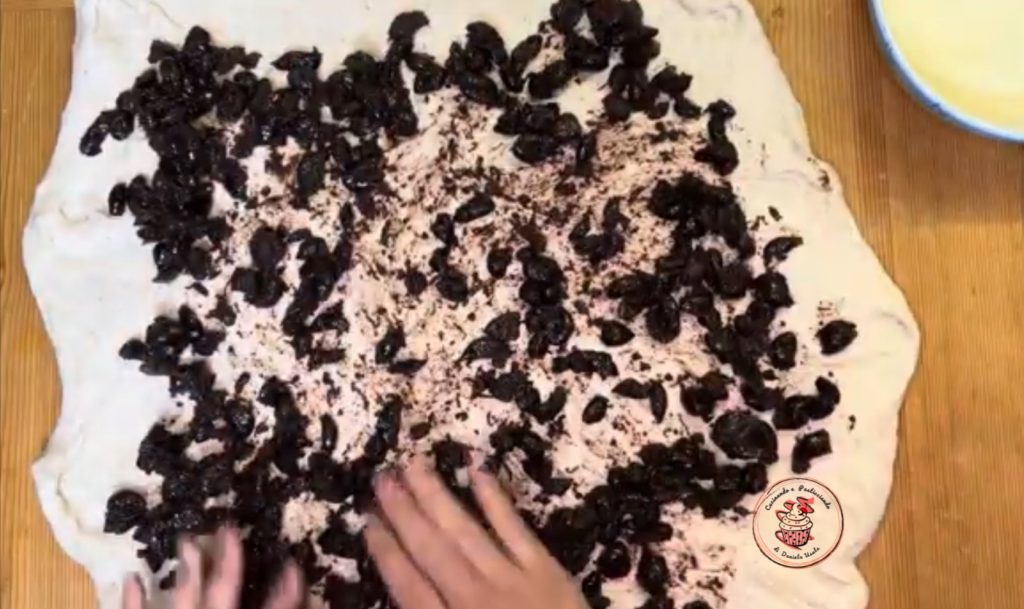 Volver a trasladar sobre la mesa de trabajo y extender la masa. Colocar las aceitunas en el centro.