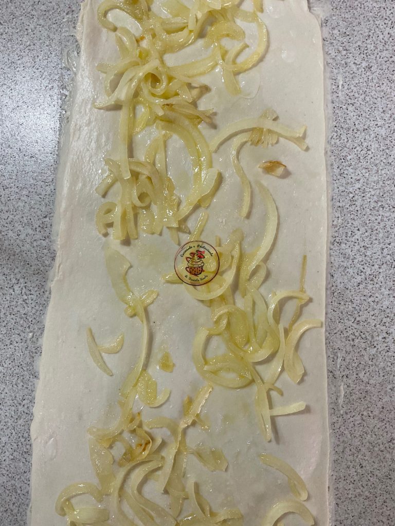 Recuperar la masa y extenderla sobre la encimera. Añadir las cebollas frías.