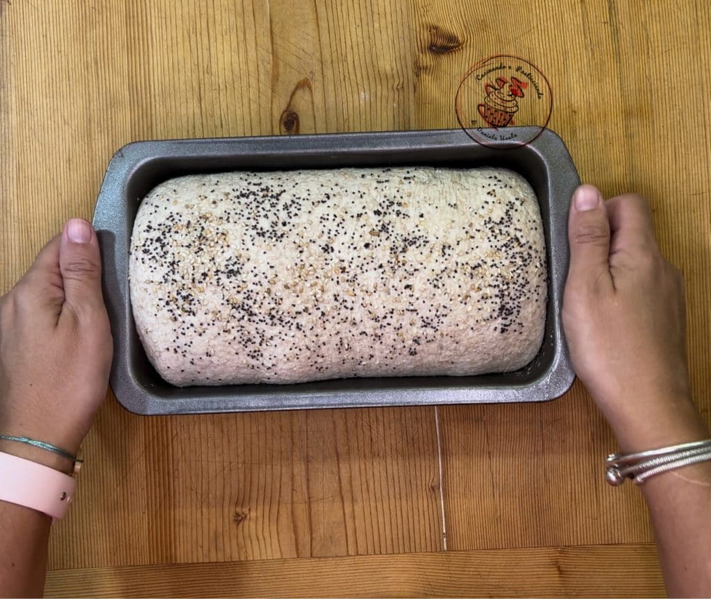 Y lo trasladé al molde aceitado. Pincelado la superficie con un poco de agua y añadí las semillas. Luego la cubrí con film.
