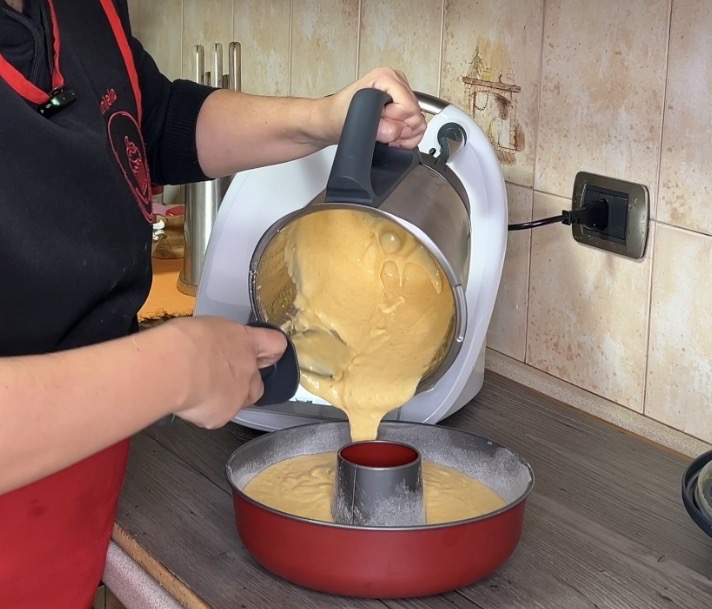 Transferimos la mezcla a un molde para bizcocho de 24 cm engrasado y enharinado y horneamos durante 40 minutos a 180°.