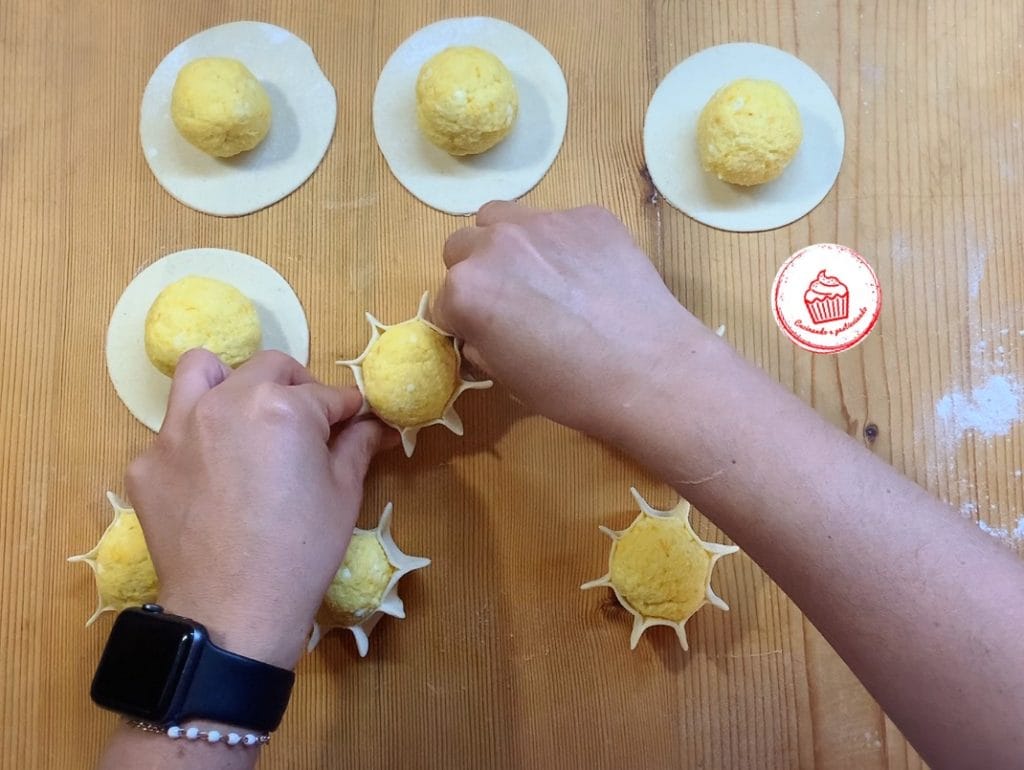 Pasado el tiempo de reposo, extender la lámina con la laminadora poner una nuez bastante grande de masa. Con las yemas de los dedos cerrar los bordes haciendo pequeñas presiones.