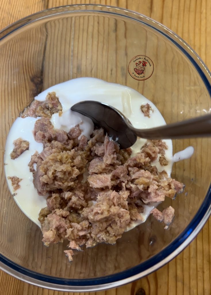 En un bol, verter la nata y el atún escurrido y mezclar.