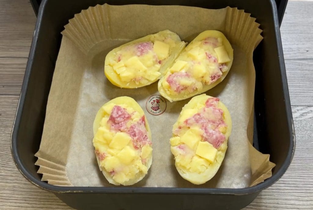 Rellenar de nuevo las cáscaras de las patatas, rociar un poco de aceite y cocinar 10 minutos a 195° luego otros 5 minutos con el grill.