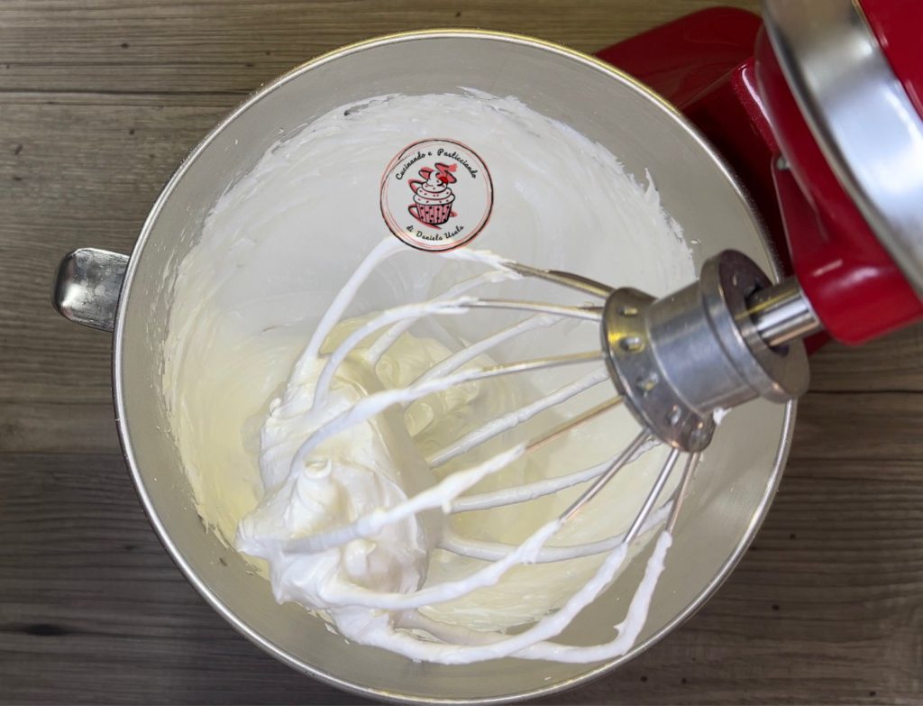 En el bol de la batidora de pie colocamos las claras de huevo (deben estar a temperatura ambiente durante al menos 24 horas). Comenzamos a batir y agregamos gradualmente el azúcar, el zumo de limón y la fécula de maíz. Debemos obtener un merengue bien firme.