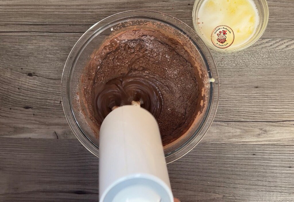 Incorporar la harina tamizada con el cacao y la levadura y continuar mezclando todo.