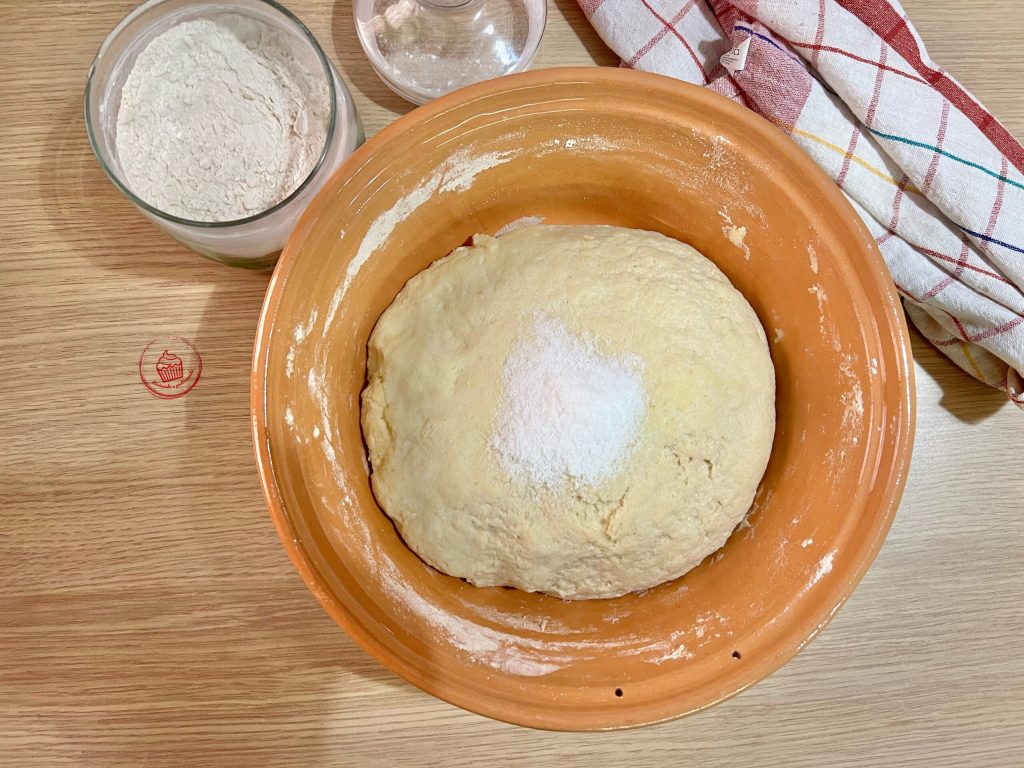 He dejado fermentar en la bandeja hasta duplicar, luego he pincelado con una salmuera de agua, aceite y sal y he horneado a 200° durante unos 20 minutos.