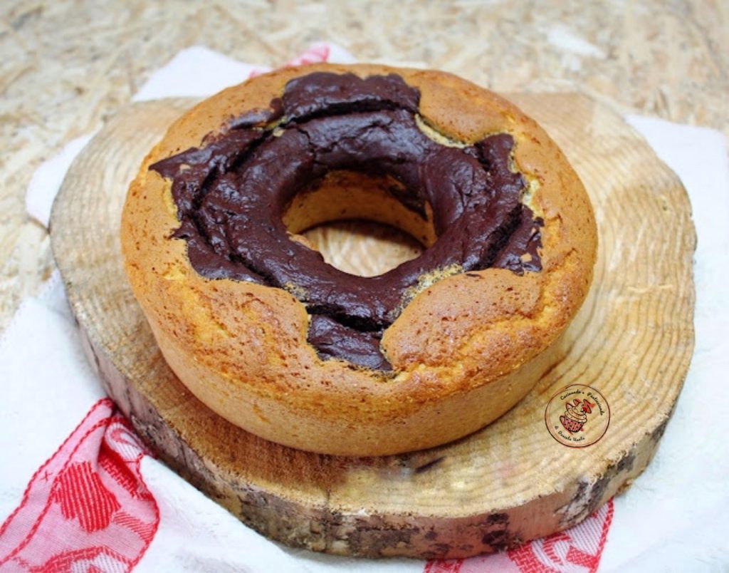 • He vertido 3/4 de masa blanca en un molde de 26 cm engrasado y enharinado. A la masa restante le he añadido el cacao. He mezclado bien y he añadido la masa negra a la masa blanca. He horneado a 180° por unos 40 minutos.