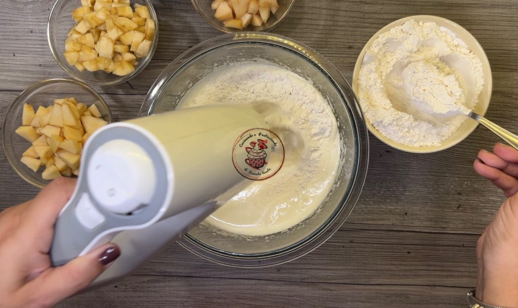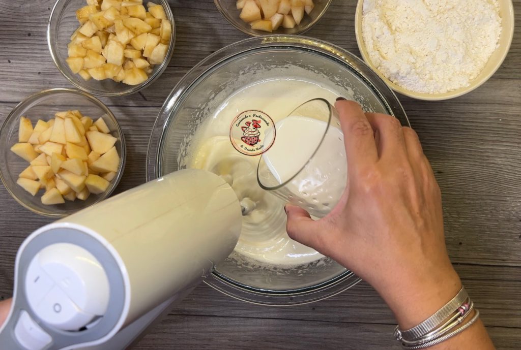 Con la batidora eléctrica, pero a menor velocidad, añadir el aceite y la leche.