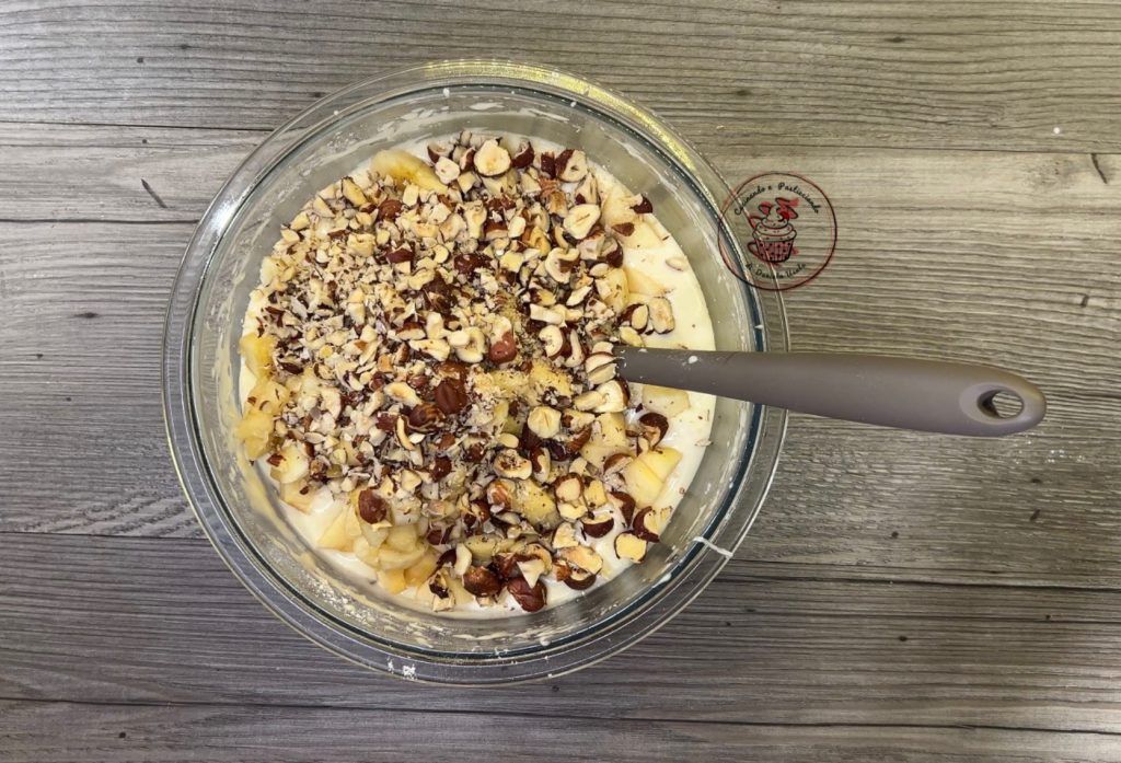 Mezclar con la espátula y añadir la manzana, la pera y el plátano cortados en cubitos y las avellanas picadas a cuchillo.