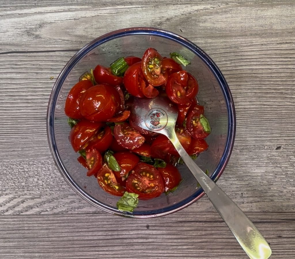 Mientras tanto preparamos el relleno. En un bol rebanamos los tomates cherry.