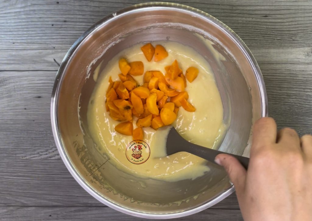 Añade 4/5 albaricoques cortados en cubitos a la mezcla y mezcla de nuevo.