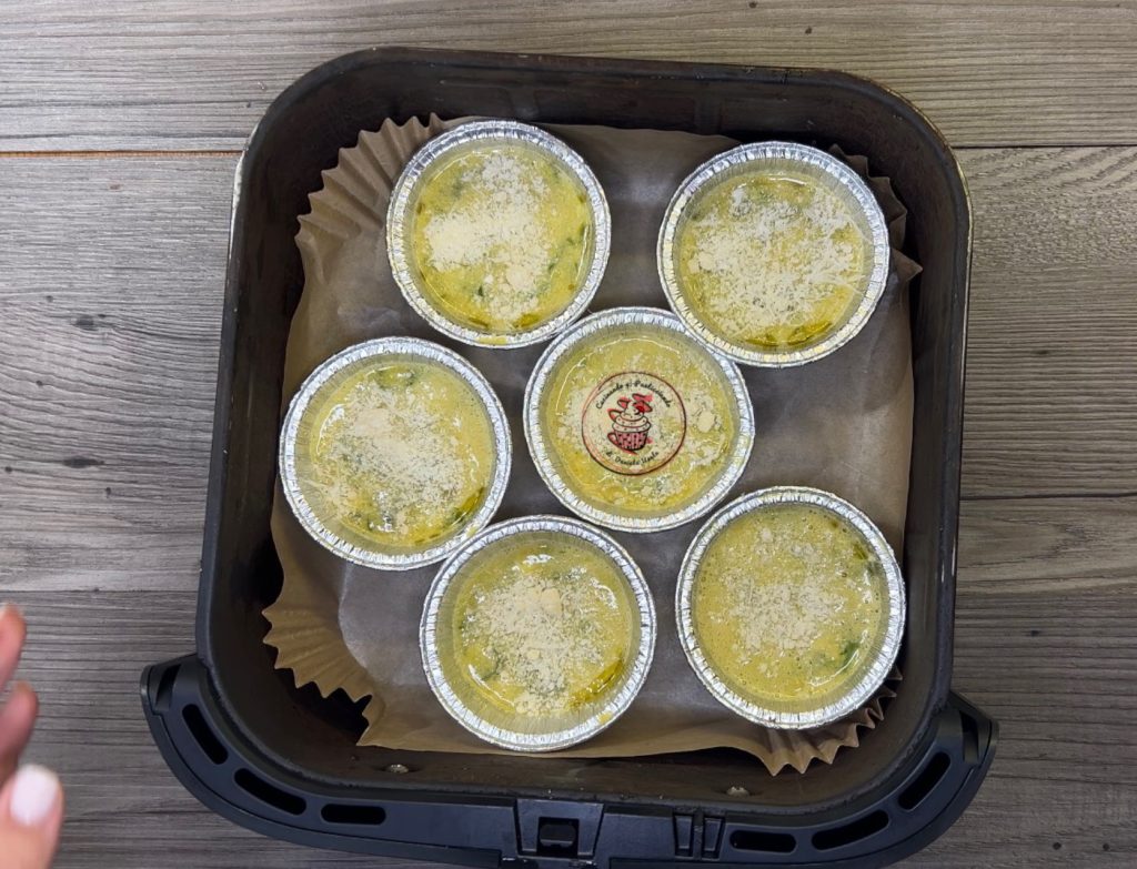 • Coloca los moldes en la cesta de la freidora de aire, espolvorea un poco de queso rallado y cuece durante unos 15 minutos a 190°.
