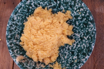 Corta la polenta en trozos y colócala en el prensapatatas. Recoge la «pulpa» en el bol