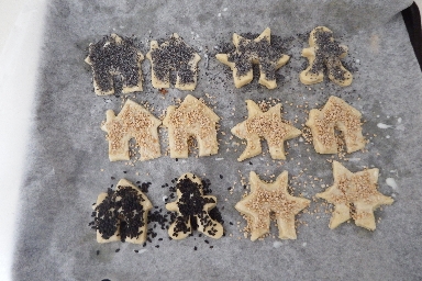 Coloca los aperitivos sobre la bandeja forrada con papel de horno, pincela con leche y decóralos con semillas de sésamo y amapola.