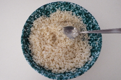 Enjuaga bien el arroz bajo agua corriente en el colador, de esta manera eliminarás el almidón. Hierve el arroz en agua con sal, escúrrelo, ponlo en el bol con un chorrito de aceite, mezcla y deja enfriar