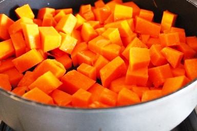 • Vuelve a colocar la crema de calabaza en la sartén, añade la calabaza dorada y mezcla con cuidado