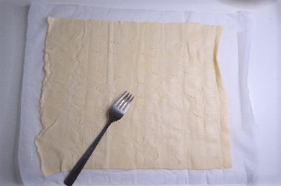 • Saca el rollo de masa de hojaldre del frigorífico y desenrolla sobre el papel de horno. Pincha la masa excepto los bordes.