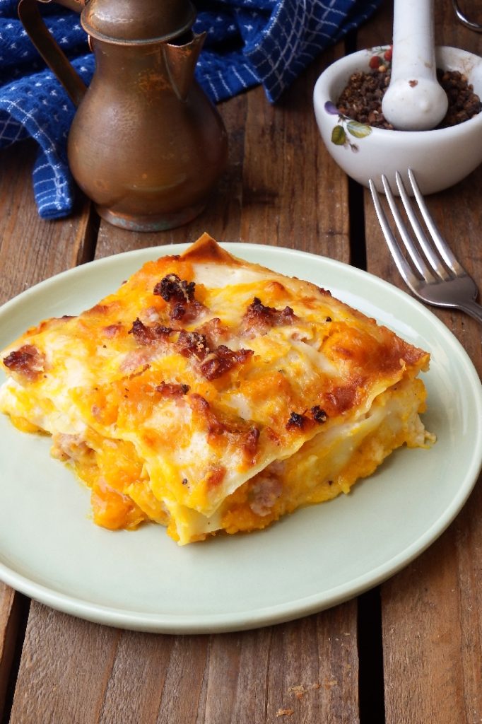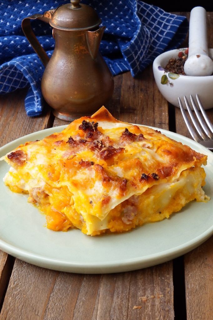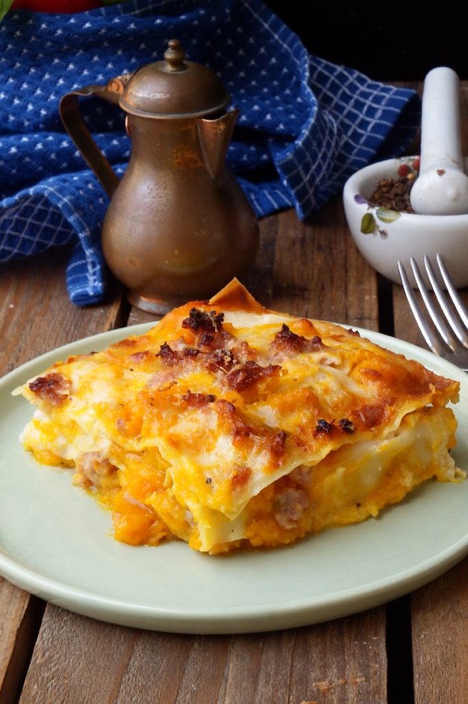 La lasaña con calabaza, salchicha y asiago es un delicioso primer plato, preparado con pasta al huevo hecha en casa, perfecto para los almuerzos del domingo durante la temporada de otoño. ¡Un derroche de sabores que una vez más os recomiendo encarecidamente!
