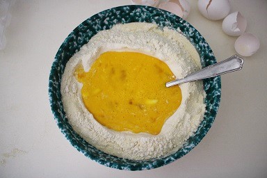 Mezcla las dos harinas y colócalas en forma de volcán sobre la mesa de trabajo o en un bol. Rompe los huevos en el centro del volcán con una pizca de sal. Bate los huevos con el tenedor y luego, poco a poco, ayudándote con las manos, incorpora la harina de los lados hacia el centro. En este punto puedes empezar a trabajar la masa con las manos