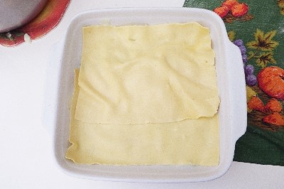 Unta el fondo de la fuente para horno con un cucharón de bechamel. Coloca encima las hojas de lasaña recién preparadas