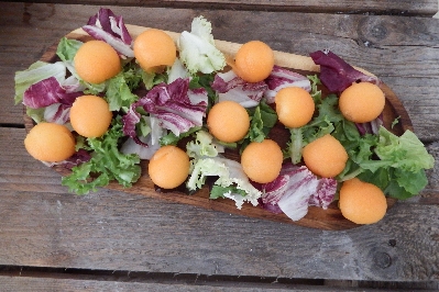 • Coloca las hojas de ensalada mixta en la tabla, pon encima las bolitas de melón