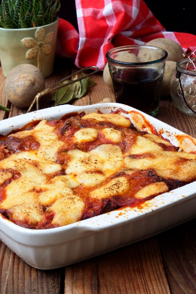 Unta encima más salsa de tomate y adorna con queso para fundir y parmesano. Ahora que nuestro pastel de berenjenas y patatas está listo, cocínalo en el horno precalentado a 180° durante 40-45 minutos. Saca del horno y deja reposar durante 5-10 minutos antes de cortar en rodajas y servir en la mesa.