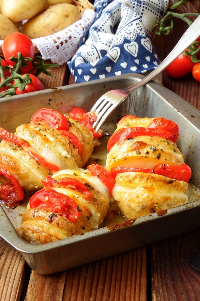 Las patatas en abanico con tomatitos y mozzarella son un segundo plato genuino y delicioso para llevar a la mesa. ¡Una idea original preparada con poquísimos ingredientes pero hecha especial en un santiamén!