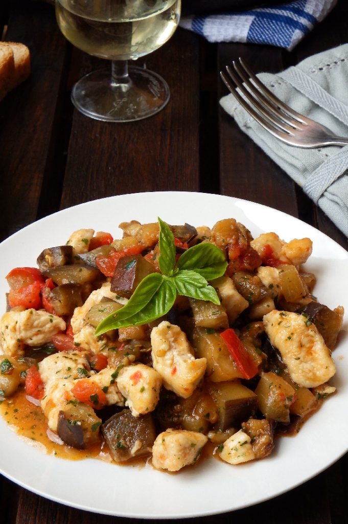 El pollo al funghi es una reinterpretación, aunque no demasiado, de las míticas berenjenas al funghi, un plato típico de la tradición campana, compuesto de berenjenas y tomates y generalmente servido como guarnición.
