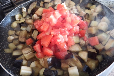 Vierte el aceite en la sartén y añade los dientes de ajo y enseguida las berenjenas. Cocina durante unos 10 minutos, removiendo de vez en cuando