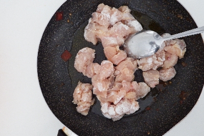Primero, corta el pollo en cubos y enharínalo. Añade un poco de aceite en la sartén donde cociste las verduras y pon el pollo