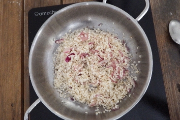 • Pon la cebolla finamente picada en la cacerola. Añade el arroz y tuéstalo durante dos minutos a fuego alto, removiendo frecuentemente. El tostado del arroz es una parte fundamental para preparar un risotto perfecto, ya que mantiene el grano compacto, liberando gradualmente el almidón durante la cocción, haciéndolo cremoso. Desglasa con el vino blanco y deja que se evapore.