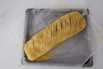 • Coloca el strudel sobre la bandeja cubierta con papel de horno y pincela con el huevo batido