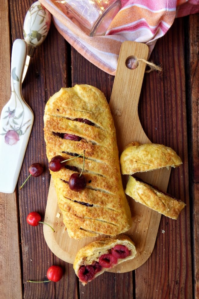 El strudel de cerezas es un dulce veraniego rústico y delicioso, compuesto por una capa crujiente que encierra un relleno riquísimo a base de cerezas y galletas.