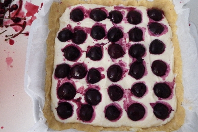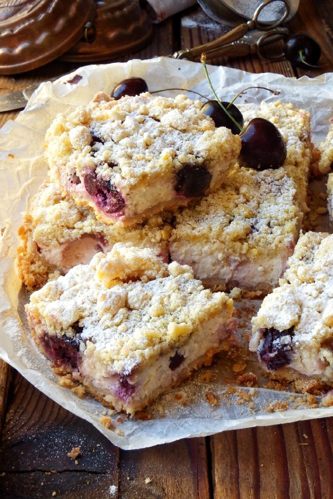 La receta del día que estoy a punto de mostrarles es esta deliciosísima tarta desmigajada con ricotta y cerezas, facilísima de hacer y súper deliciosa! Un postre que preparo a menudo el día antes y que sirvo a mis invitados fresco del frigorífico y cortado en cuadraditos.