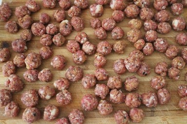 • Trabaja la mezcla durante mucho tiempo para que se amalgame bien. Forma albóndigas pasándolas por la palma de las manos y dándoles forma esférica