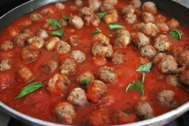 • Coloca las albóndigas en la salsa y cocina tapadas con la tapa durante 15 minutos a fuego bajo, quita la tapa, mueve la sartén para que las albóndigas se balanceen en la sartén y continúa cocinando durante otros 10 minutos hasta que estén cocidas y la salsa sea oscura y espesa
