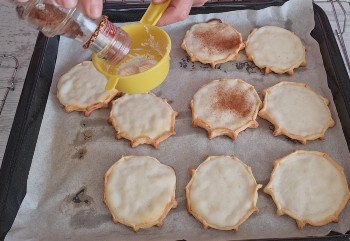 Saca los dulces del horno y déjalos templar, luego distribuye sobre la superficie de la ricotta algunos toques de canela en polvo.