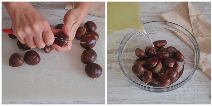 Con un cuchillo afilado realiza un corte en las castañas en la parte abombada.