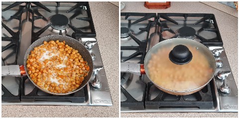 Añade los garbanzos y mezcla, luego incorpora el curry y deja que se sazone durante unos minutos removiendo a menudo.