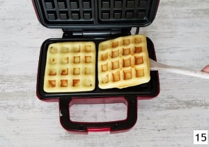 Retira los gofres de la plancha (15) y procede con la cocción de los demás gofres. No es necesario volver a untar la plancha con mantequilla.