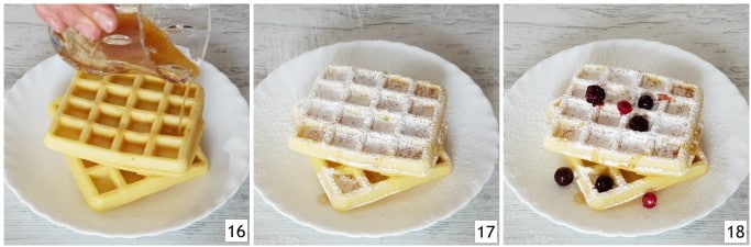 Puedes servir los gofres con mermelada, jarabe de arce, nutella, nata o cualquier otra cosa. Yo los serví con miel (16) ligeramente derretida al baño maría, azúcar glas (17) y frutos del bosque (18).