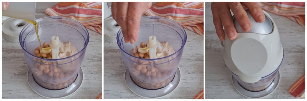 Enciende la batidora y mezcla hasta obtener una crema (decide si prefieres un hummus suave y cremoso o más rústico). Si es necesario, puedes añadir algunas cucharadas de agua.