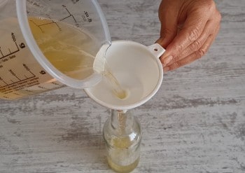 Filtra el alcohol aromatizado al plátano haciéndolo caer en un bol, luego fíltalo una segunda vez haciéndolo pasar a través del colador forrado con una gasa.