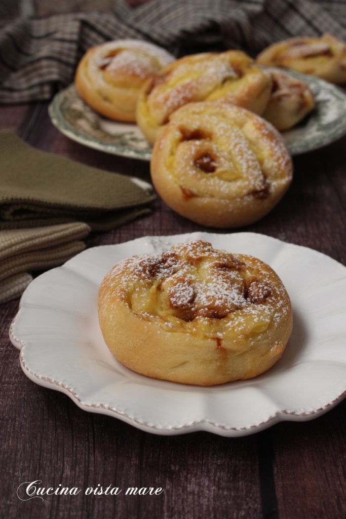 Los rollos daneses a mi manera son suaves y deliciosos brioche rellenos con crema pastelera y pasas en la receta clásica. Pero debido a que olvidé comprar las pasas y tenía muchas ganas de prepararlos porque ya estaba pensando en ello, en lugar de pasas puse pepitas de chocolate blanco al caramelo. Por eso rollos daneses a mi manera. Espero que me perdonéis esta libertad. De todos modos, estaban buenísimos, pero si queréis los rollos daneses tradicionales, poned las pasas y si no encontráis las pepitas de chocolate blanco al caramelo pero no os gustan las pasas, poned pepitas de chocolate negro.