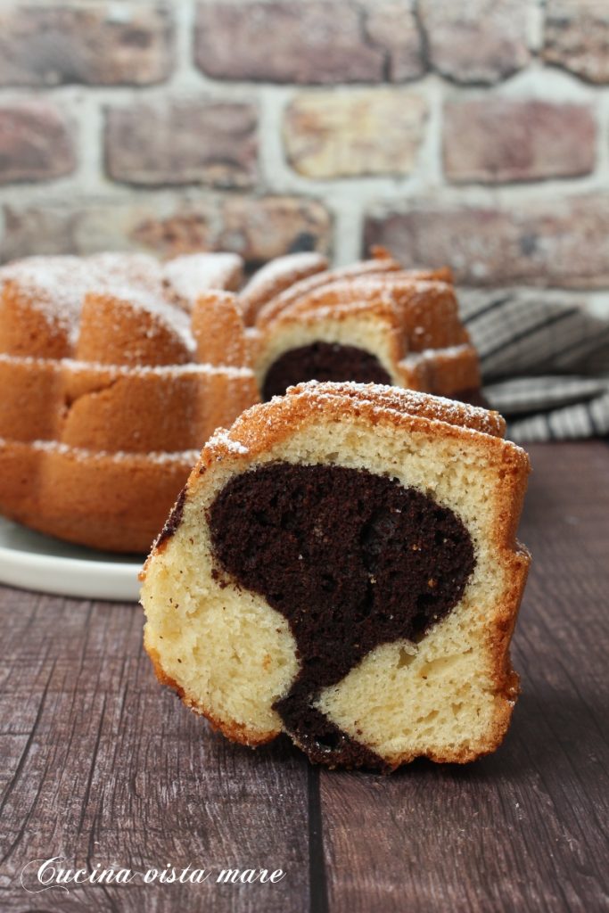 A la mezcla restante agregar el cacao amargo y la leche reservada y mezclar. Distribuir la mezcla de cacao sobre la mezcla clara y hornear el pastel en horno precalentado a 180 °C durante 40/50 minutos.